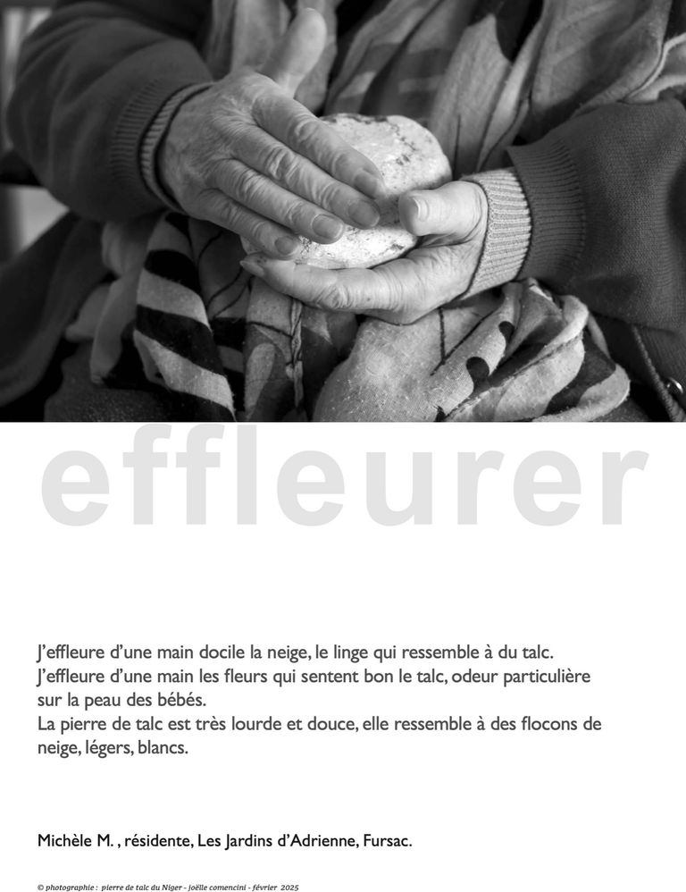 2025 débute par la découverte en petit groupe d'objets insolites, à manipuler, à sentir, à reconnaître ou non. Une série de photos des mains des résidents est prise et donnera lieu à un jeu de cartes postales puis à la partiicpation à un concours sur l'hygiène des mains.