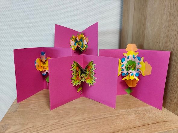 création de pop up avec différents papiers, sur le thème floral.